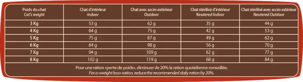 Si vous donnez cet aliment pour la première fois à votre chat, effectuez pendant quelques jours une transition progressive avec l’ancien aliment, afin qu’il puisse s’adapter naturellement à ce nouveau régime alimentaire.