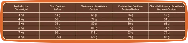 Poids de forme : un ratio protido-calorique équilibré et un tableau de rationnement particulièrement bien adapté au chat stérilisé, pour un maintien du poids de forme optimal.